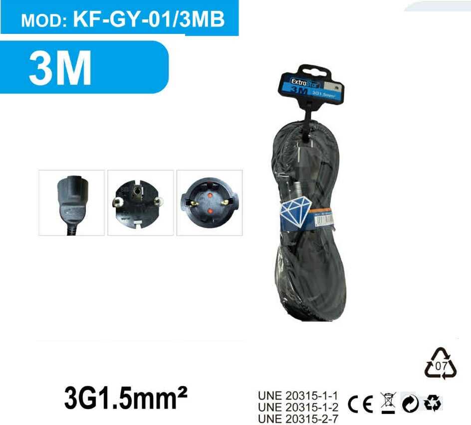 A hosszabbító 3 méteres kábellel, földelt hálózati dugóval és egyenes kialakítású, gyermekvédelemmel ellátott lengő aljzattal rendelkezik. A belső rézvezeték keresztmetszete 3G 1.5 mm2. A termék megfelel az UNE 20315-1-1, UNE 20315-1-2 és UNE 20315-2-7 szigorú biztonsági szabványoknak.