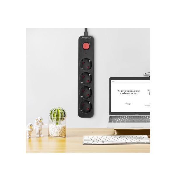 * 1 db 4-es hálózati elosztó 3 méteres kábellel (3G1.5 mm²), kapcsolóval, fekete színben.