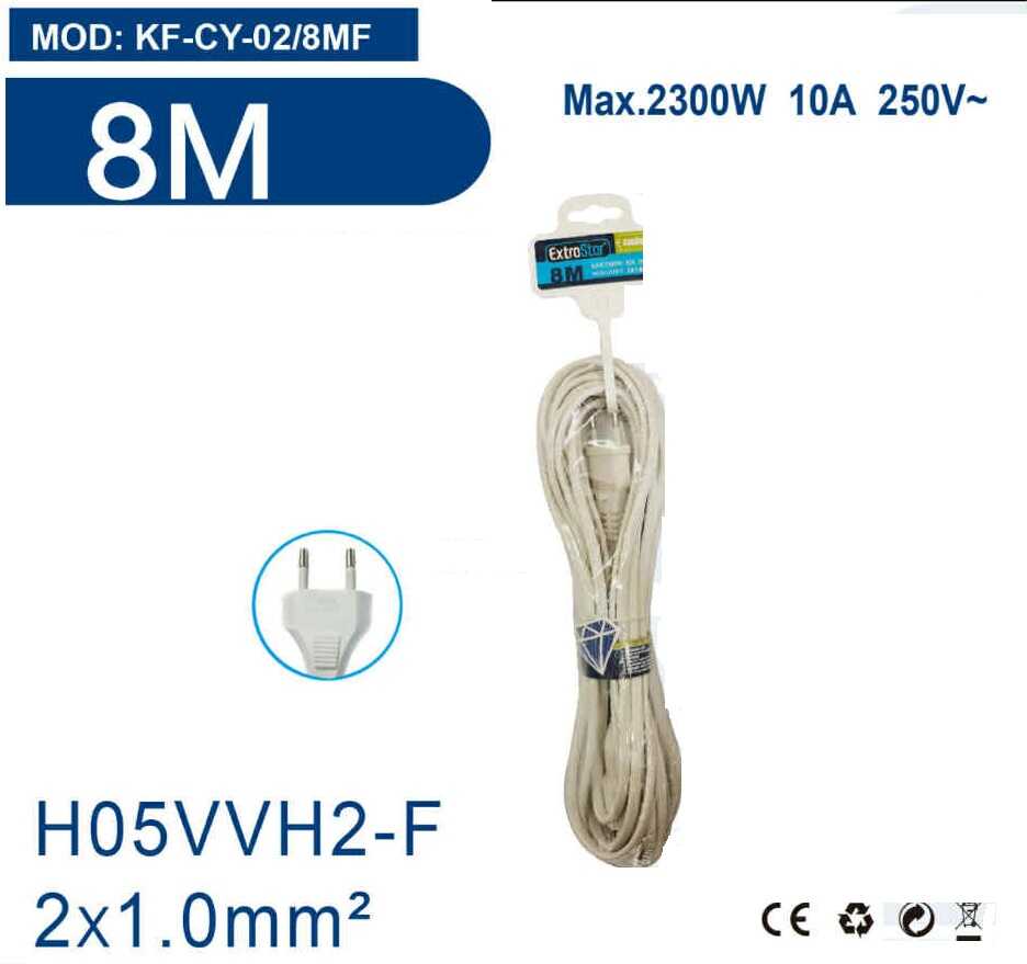 A termék egy speciális lapos Euro-csatlakozóval és egy lengő aljzattal rendelkezik. A 8 méteres vezeték típusa H05VVH2-F 2×1.0mm2, amely maximum 2300W teljesítményig biztonságosan terhelhető. A készülék 230V/50Hz hálózati feszültségen való használatra hitelesített.