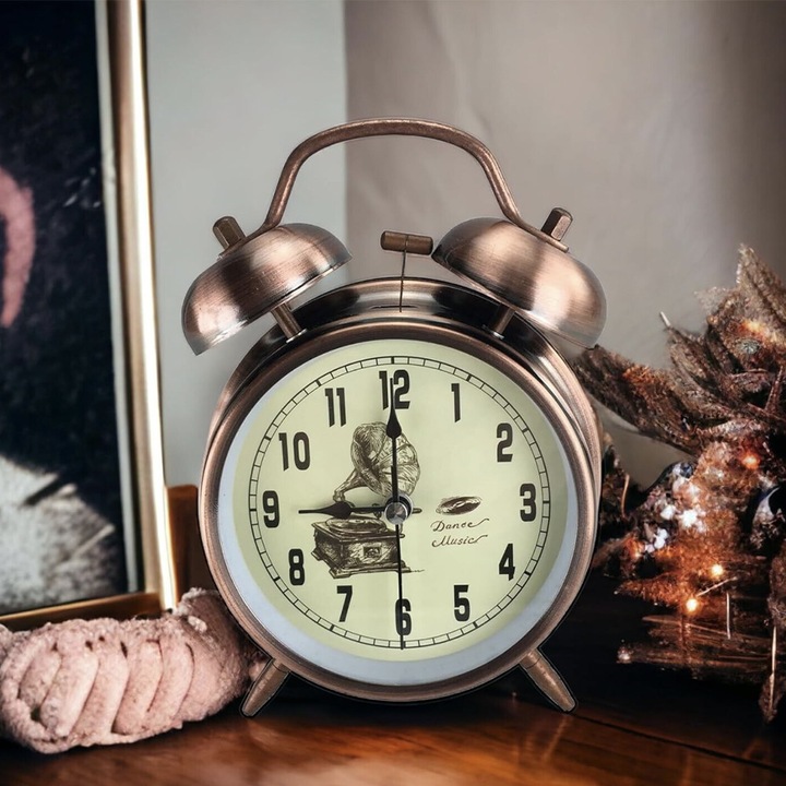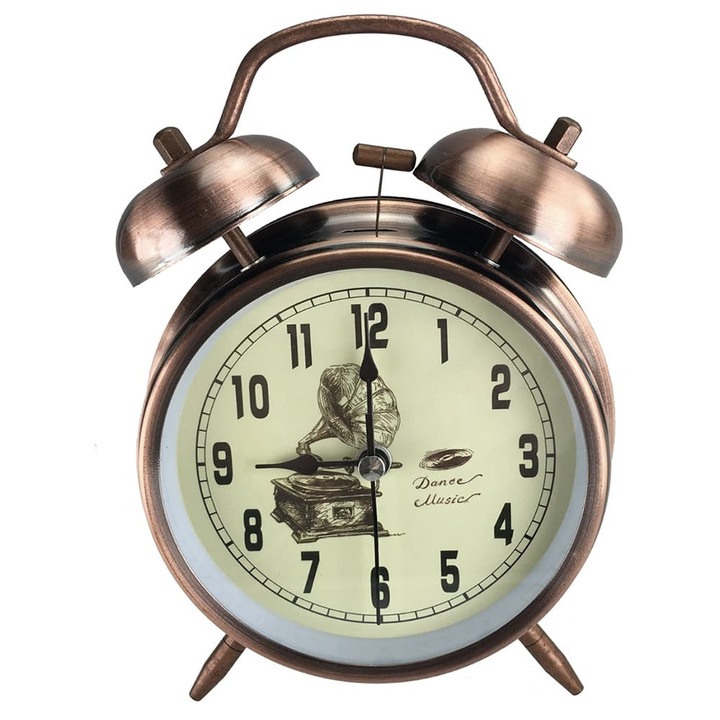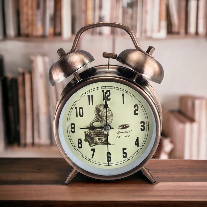 – Dizájn: Antikolt bronz színű fém ház valódi fém harangokkal és stabil lábakkal