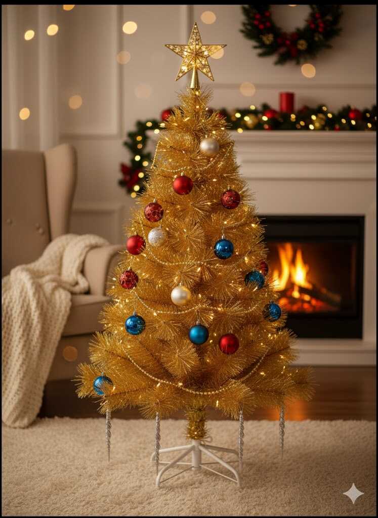 Ragyogó aranyszín: Különleges és elegáns megjelenést kölcsönöz, amivel azonnal a figyelem középpontjába kerül. Tökéletes választás, ha valami egyedire vágysz a hagyományos zöld fenyő helyett.