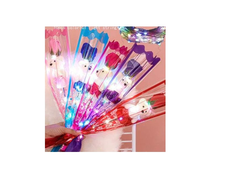 A csomag tartalma: 1 db díszcsomagolt örök rózsa, 1 db kismaci, beépített színes LED fényfüzér.