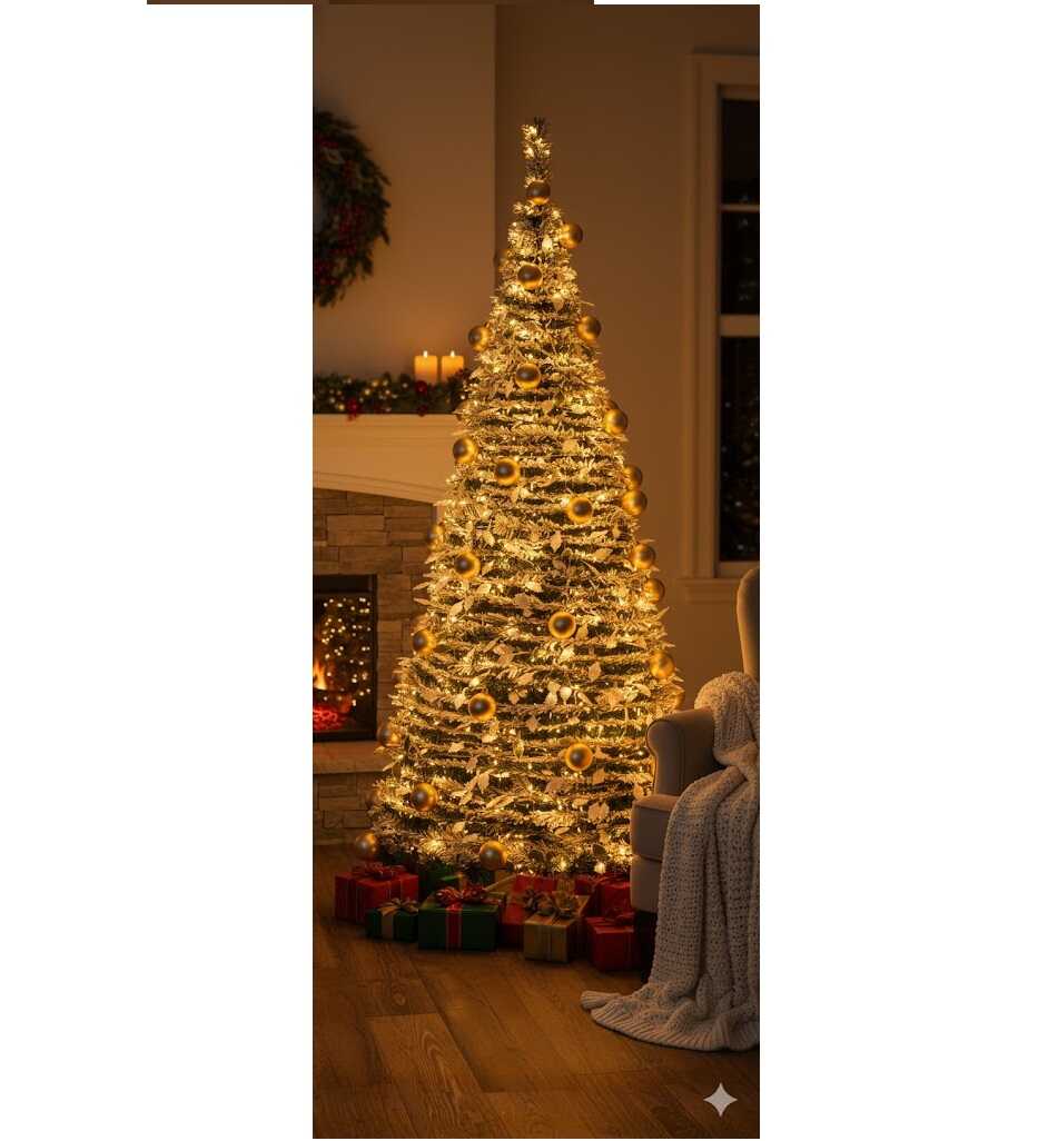 Azonnali ünnepi dekoráció: Mivel a fa már beépített LED világítással és előre felfűzött aranyszínű díszekkel érkezik, percek alatt felállítható és gyönyörködhetsz benne.
