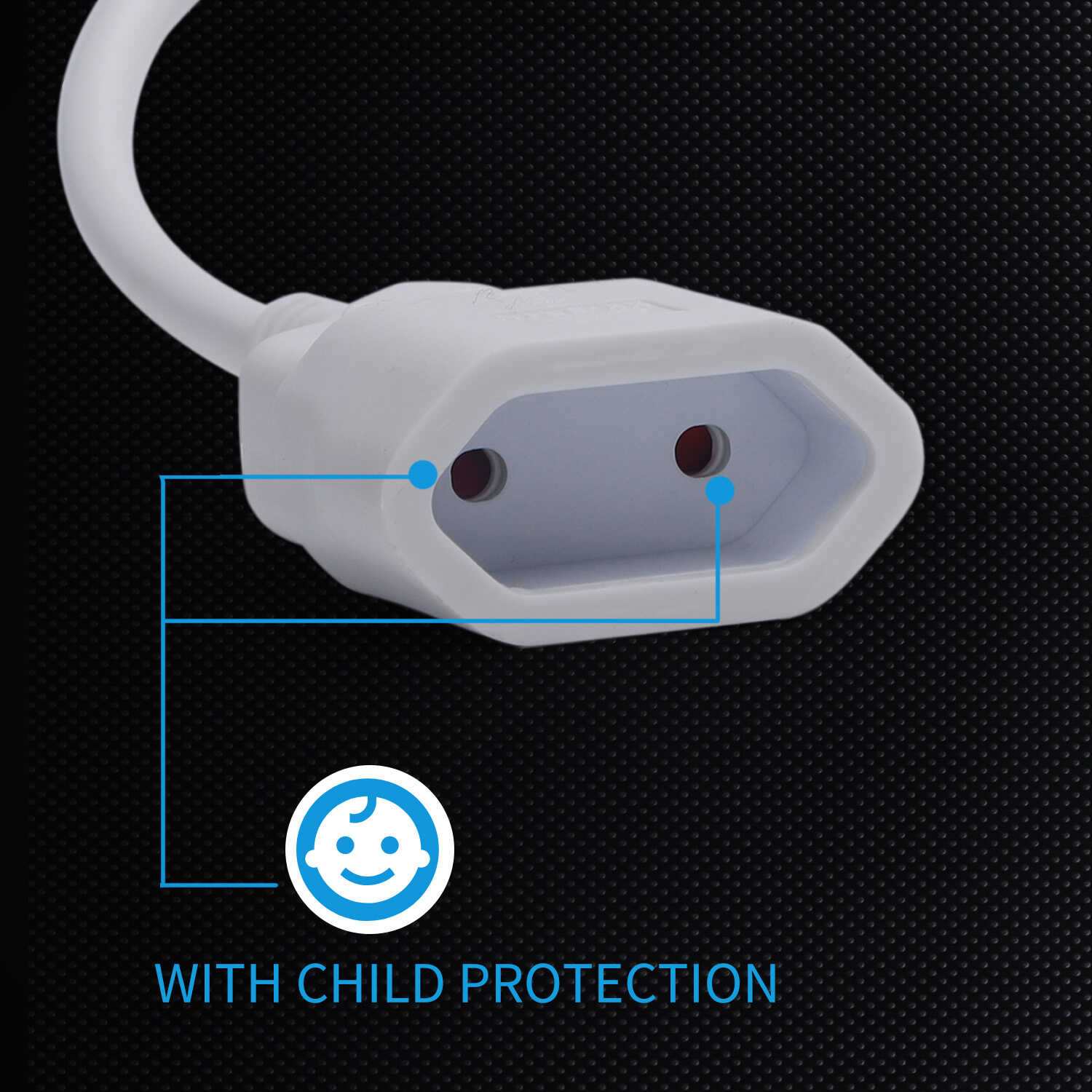 A termék megfelel a CE biztonsági előírásoknak, és gyermekvédelmi zárral ellátott aljzattal rendelkezik a maximális nyugalom érdekében.