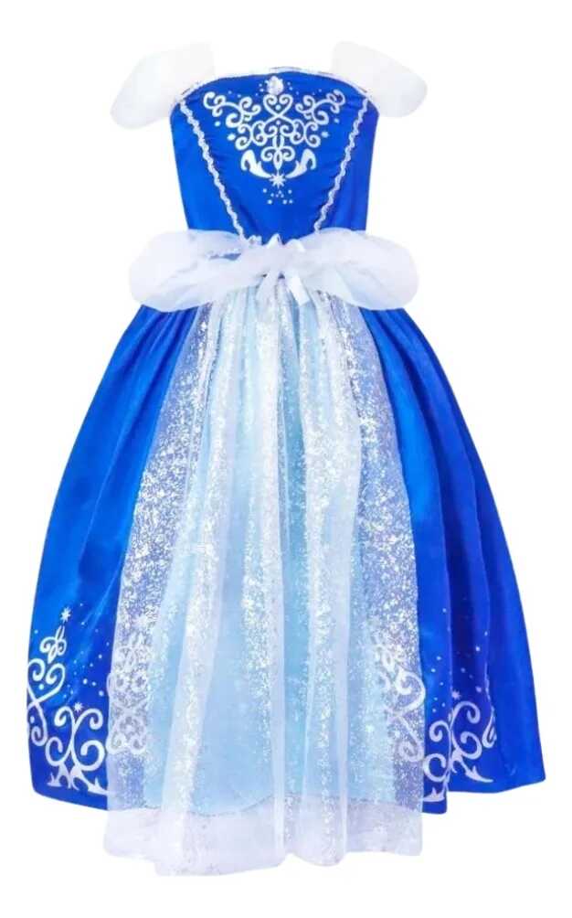 Dús, rétegezett szoknya: A mélykék selyemfényű anyagot világoskék tüllréteg és egy látványos, átlátszó masni egészíti ki, amely hűen idézi Hamupipőke ikonikus megjelenését.