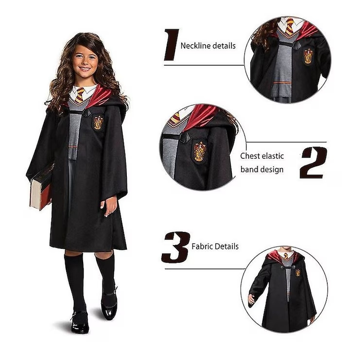 Ez a hiteles megjelenésű szett lehetővé teszi a gyermekek számára, hogy a Harry Potter sorozat legokosabb boszorkányának bőrébe bújjanak. A kosztüm minden részletében megidézi a Roxfort Boszorkány- és Varázslóképző Szakiskola hangulatát, így garantált sikert arat minden eseményen.