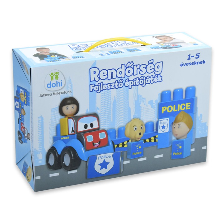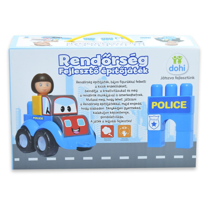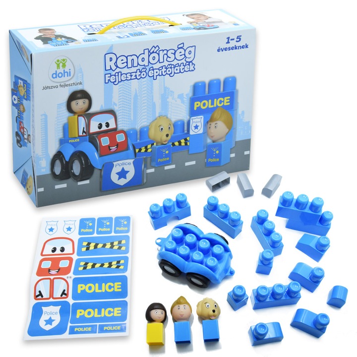 A játék egyedi eleme a rendőr tematikájú matrica, amellyel a gyerekek feldíszíthetik a kockákat, és akár egy rendőrautót is építhetnek belőlük. Ez a tevékenység fejleszti a kreativitást, a problémamegoldó képességet és a kézügyességet is.