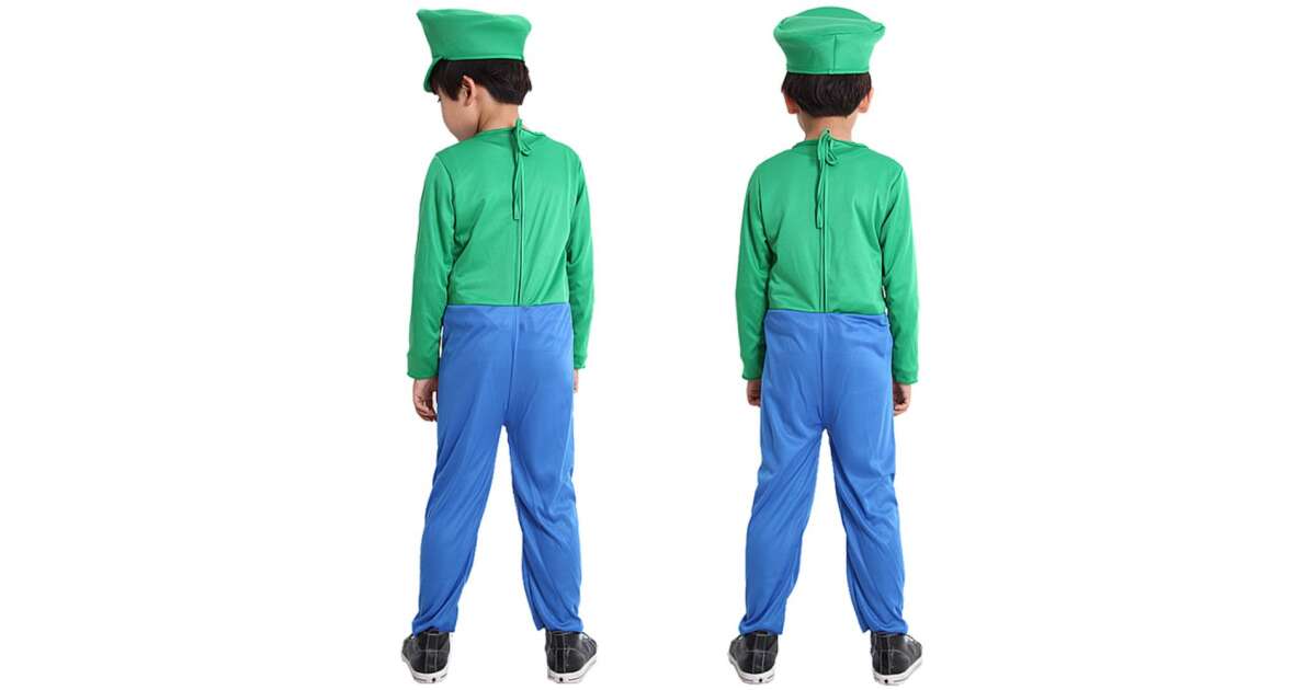 Ikonikus Overál és Felső: A jelmez egybefüggő kialakítású, amely ötvözi a jellegzetes zöld hosszú ujjú felsőt a kék nadrággal (overállal). Az elején található nagy sárga gombok (nyomtatott vagy rátétes kivitelben) még élethűbbé teszik a megjelenést.