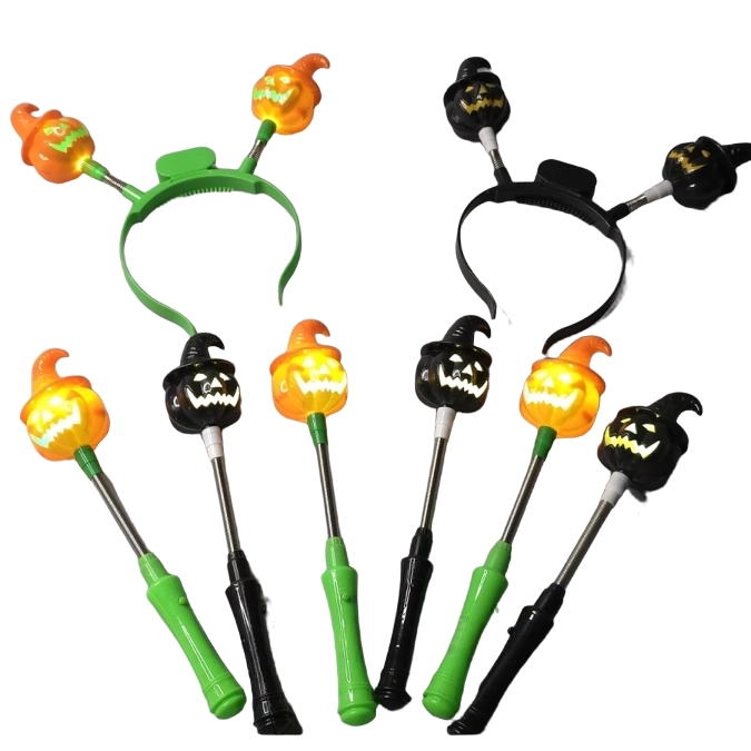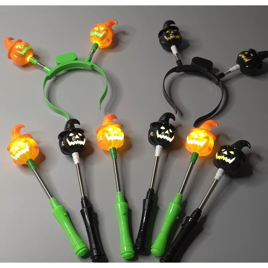 A fejdíszen lévő két, hegyes boszorkánykalapos tökfigura vidáman világít. A varázspálca szintén világító tökkel van ellátva, amely hosszan tartó fényt biztosít. A kiegészítők könnyen használhatók, és biztonságosak, így a gyermekek is bátran használhatják őket. A termék többféle színben is elérhető.