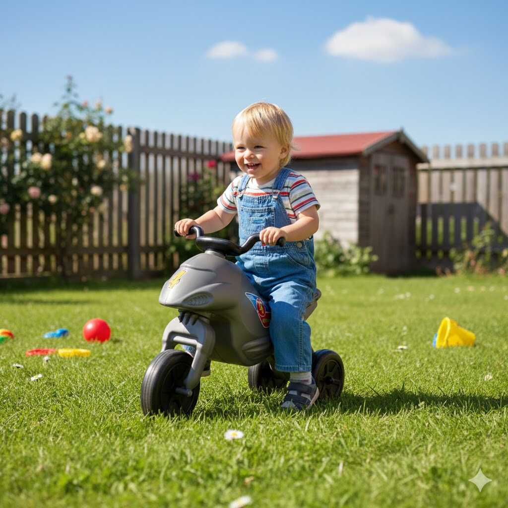 A futómotor magas minőségű, ütésálló műanyagból készül, szürke alaptesttel és fekete kerekekkel. Elsősorban a 1,5 és 3 év közötti korosztály számára ideális, segítve az átmenetet a stabil üléstől a kétkerekű kerékpározásig.