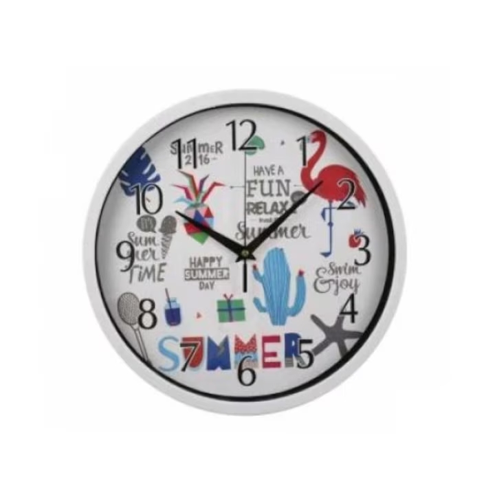Ez a színes dekoratív falióra a napsütéses tengerparti élményeket idézi fel minden alkalommal amikor ránéz A vidám grafika flamingóval kaktusszal és nyári feliratokkal nemcsak az időt mutatja pontosan hanem stílusos és élettel teli dísze lehet a gyerekszobának konyhának vagy akár egy nyaralónak is