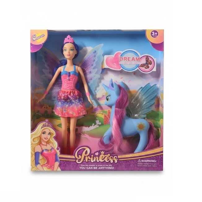 Készen áll a gyermeked egy igazi mesebeli kalandra? Ez a Tündér hercegnő baba a tökéletes társ a varázslatos történetekhez! A baba színes, csillogó ruhában és tündérszárnyakkal érkezik, és egy bájos, kékszínű unikornis lovacska kíséri. A játék nemcsak szórakoztat, hanem fejleszti a gyermeked kreativitását és fantáziáját, miközben a saját varázslatos meséit alkothatja meg. Az unikornisnak is van szárnya, így együtt repülhetnek a felhők között, és fedezhetik fel a mesebeli birodalmakat.