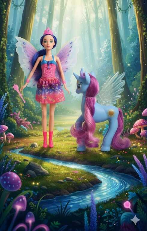 Tündér hercegnő: A baba rózsaszín és kék színű, csillogó ruhában és hozzáillő tündérszárnyakkal van öltözve. A haja kék és hosszú, ami fésülhető. A baba fején egy korona is van.