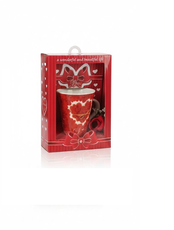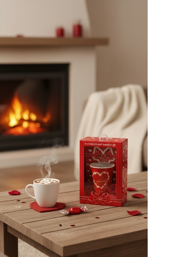 Valentin-napi Porcelán Bögre Szett, Szíves Mintával és Díszdobozban