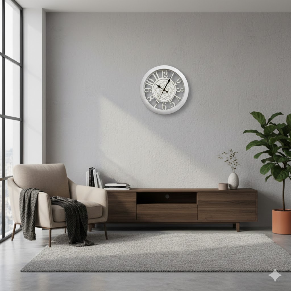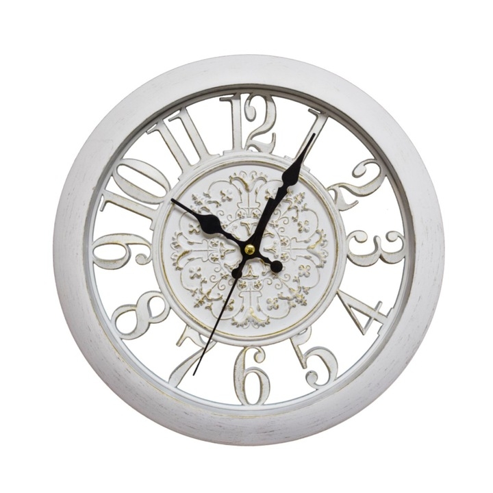 Ez a gyönyörű hófehér falióra az antikolt eleganciát ötvözi a modern precizitással Az áttört belső díszítés és a plasztikus számjegyek nemcsak az időmérést teszik könnyebbé hanem kifinomult dekorációként is szolgálnak bármely helyiségben legyen az a nappali vagy a hálószoba