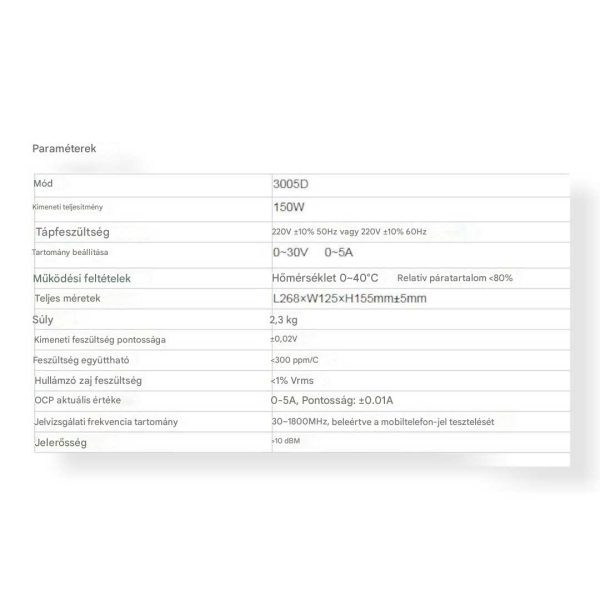 - Kimeneti tartomány: 0–30V feszültség / 0–5A áramerősség: Széles beállítási tartomány, amely lefedi a legtöbb kisfeszültségű elektronikai rendszer igényét. Előny: Sokoldalú felhasználhatóság, egyetlen készülék a legtöbb feladathoz.