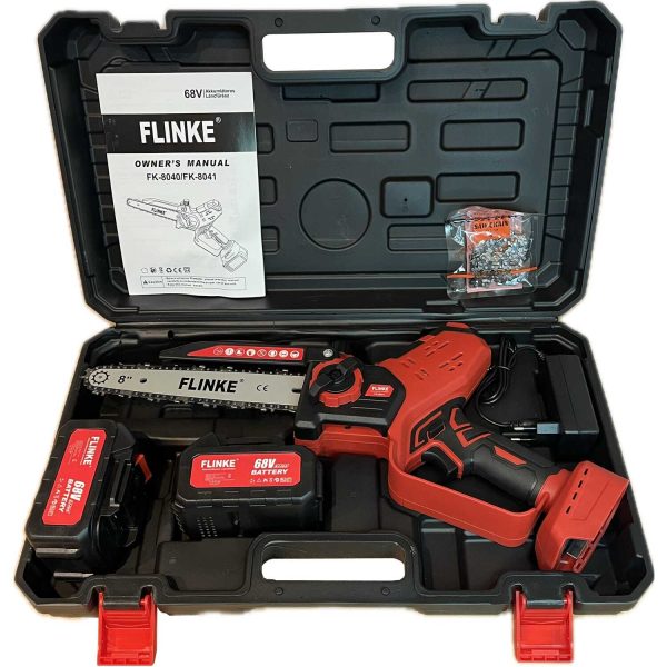 Flinke FK-8041 Elektromos Láncfűrész 2 DB 68V Akkumulátorral, Olajzással és LCD Kijelzővel Ez a kompakt erőgép a legújabb akkumulátortechnológiát ötvözi a kiváló vágási teljesítménnyel, így a metszés, gallyazás és kisebb favágási feladatok gyerekjátékká válnak. A könnyű kezelhetőség és a hosszú üzemidő garantálja, hogy a legnagyobb kertekben is hatékonyan dolgozhasson, vezeték nélkül.