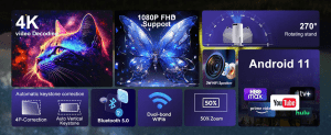 | Funkciók | Bluetooth Hordozható Beépített hangszóró 4K Game Mode Kézi fókusz Full HD Képkorrekció Keystone Correction Képtükrözés Smart TV Android 11 |