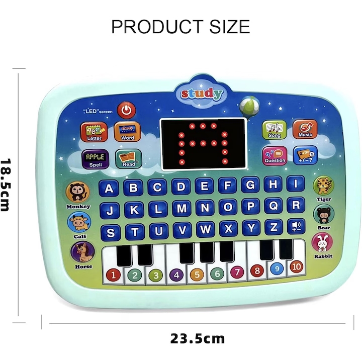 - Sokoldalú: Több mint 8 tanulási mód, köztük betűk, számok, szókincs, zene és állatismeret.