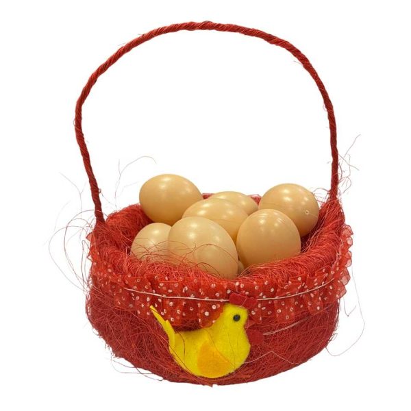 Ez a húsvéti tojásgyűjtő kosárka piros rostszálakból áll össze, melynek átmérője 17 cm, mélysége 7 cm. A fogantyúval együtt a kosár 22 cm magas. A kosár aljában fém merevítés található, így biztosan nem szakad át, és biztonságos a tojás vagy csokoládé gyűjtése. A kosár oldalán végig piros-fehér pöttyös huzal fut, melyet egy aranyos csirke figura díszít az elején.