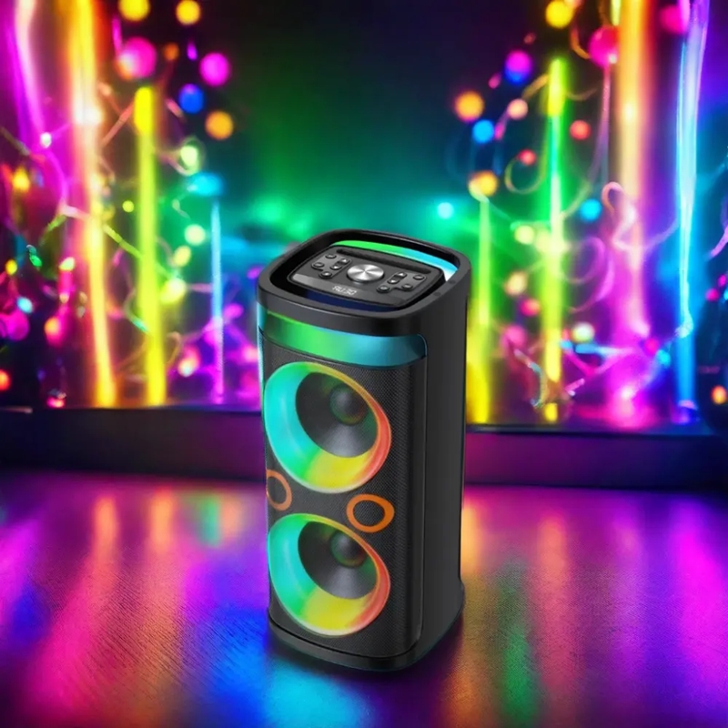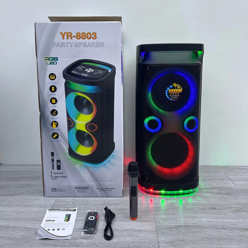 Az YR-8803 Bluetooth hangszóróval a buli garantáltan a tetőfokára hág! A dupla 8″-os hangszórók és az 50W RMS kimeneti teljesítmény garantálja a lenyűgöző hangzást, míg az RGB fények igazi diszkóhangulatot teremtenek. A beépített kijelzőn pedig könnyedén nyomon követheted a lejátszási információkat. A hangszóró számos funkcióval rendelkezik, mint például a Bluetooth kapcsolat, USB/TF kártya lejátszás, FM rádió, mikrofon bemenet, TWS (True Wireless Stereo) funkció, ébresztőóra és még sok más.